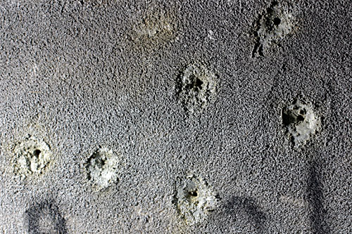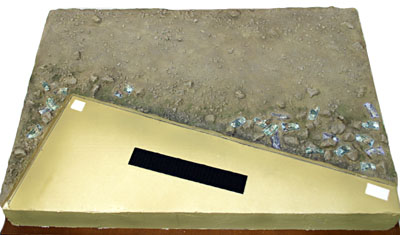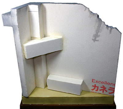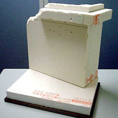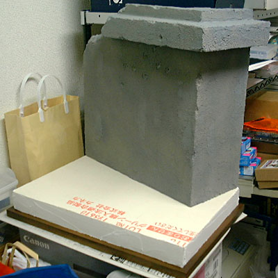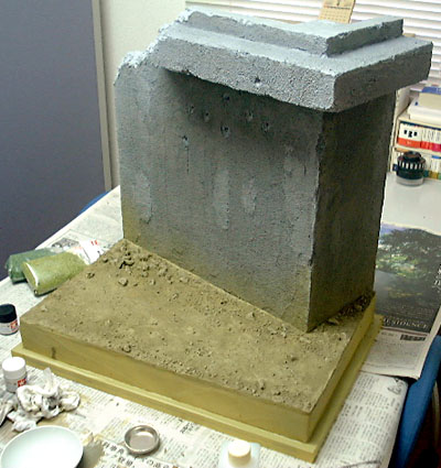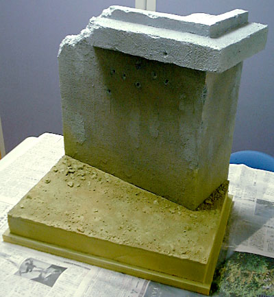 | ↑台座になるのは木製のパネルです。油絵などをキャンバスを張って描く、アレです。画材店等で手に入ります。サイズは50cm×36cm程度です。 油性のスプレーニスを塗ってあります。 その上に、周囲をモデリングペースト・ライトを塗ったスチレンパネル(厚さ6cm)を、直接シーナリーボンドで貼り付けます。一晩ほど雑誌を積み重ねて重しとし、密着させます。 壁になるスチロール(厚さ3cm)もシーナリーボンドで接着します。崩れた部分は手でむしり取ります。銃痕はボールペンで(資料写真等を見ながら)適当にグリグリと押し込んで穴を開けました。 |