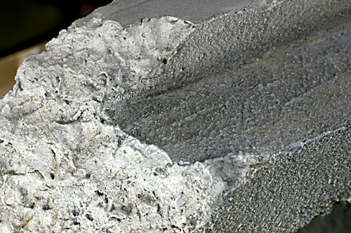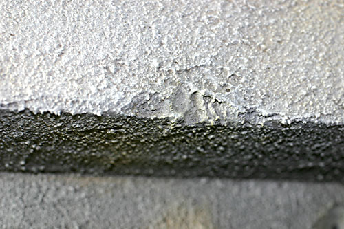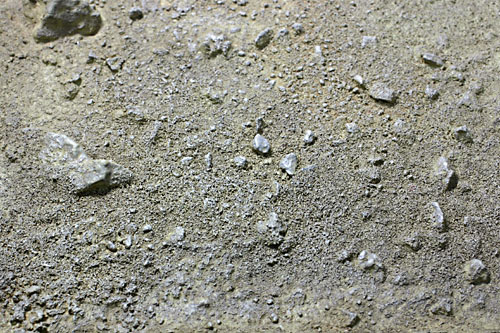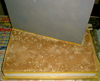 ↑今回は地面と壁を分割・組み立て出来るよう2ピースで作る為、先に壁の方をざっくりと仕上げます。 壁にはターナー製のコースパミスゲルという、ざらざらしたテクスチャーのゲルメディウムをペインティングナイフで均一に塗っていきます。途中で材料が足りなくなって来て、結局上部の張り出し部分から上は、モデリングペースト・ライトとハイ ソリッド、情景模型用の小石を混ぜて増量し、難をしのぎました。結果的に多少の質感の変化が出来て、メリハリが出ました。 とはいえ、コースパミスゲルはその質感故、スカスカなので、完成してからもスチレンパネルが透けて見えてしまいました。 完全に乾いてから、ラッカースプレーのニュートラルグレーを下塗りとして全体に吹き付けました。 |