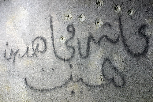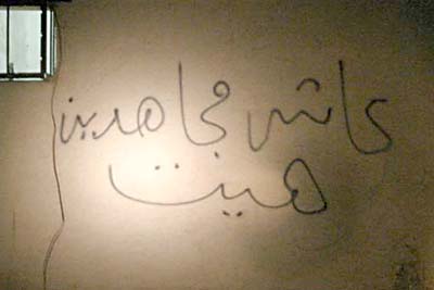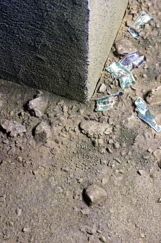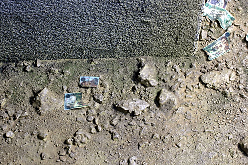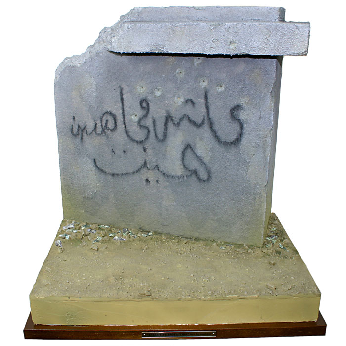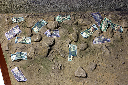 | ↑完成です。壁のグラフィティは急遽、資料写真から入れました。 一見エアブラシで描いたように見えますが、実は黒のパステルで直に描いたモノを、筆でぼかしたモノです。 地面にはメリハリを付ける為、ネット画像から作成した1/6イラク紙幣を撒きました。これもシーナリーボンドで固定してあります。 |