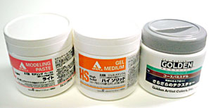 | ↑左からホルベイン製のモデリングペースト・ライト、ハイ ソリッド、ターナー製のコースパミスゲル。 モデリングペースト・ライトはその名の通り、乾燥後はとても軽くなります。ハイ ソリッドはシャープなエッジの盛り上げと、より強い接着に。 いずれも乾燥後は模型用のアクリルやラッカー塗料で塗装出来ます。 ←TOMIXのシーナリーボンド。鉄道模型を扱う店においてあります。一見、フツーの木工ボンドっぽいのでsが、元からかなりゆるめで水にも溶けやすく、乾燥後は割とつや消しな感じになります。接着も強力で塗料もアクリルやラッカーが綺麗に乗ります。 |