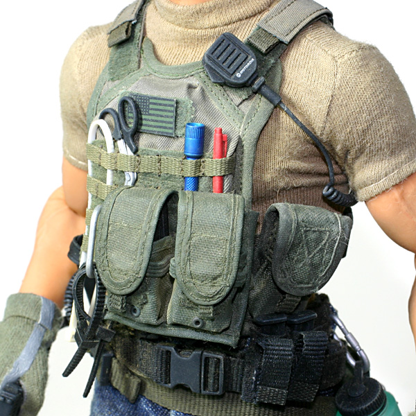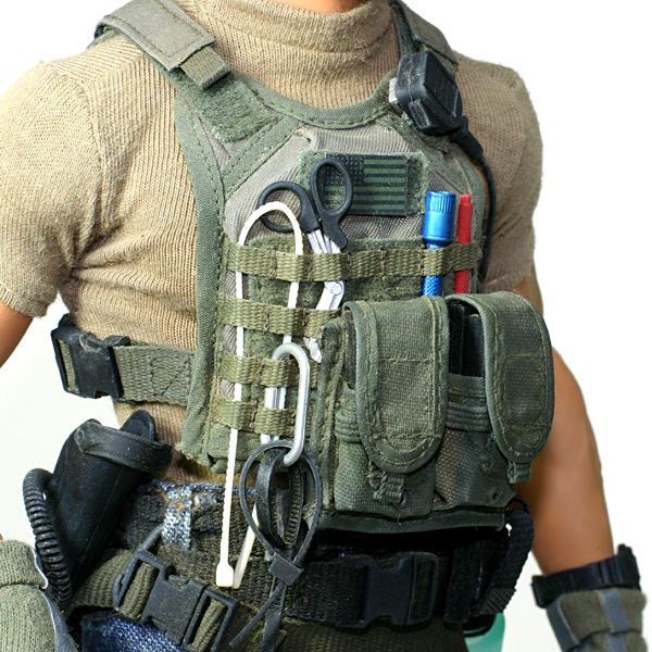 プレートキャリアの詳細は次ページに譲りますので、ここでは装着したポーチ類の解説をします。 無線機はHOT TOYSのPMC、プレキャリに差してあるハサミ、タイラップ、カラビナ、赤ペンもHOT TOYSから。黒いタイラップのみBBI。 ライトはDMLの黒いモノをシルバーで下塗り、クリアブルーを塗ってブルーフィニッシュとしました。 前面のM4マグポーチはTOY SOLDIERのTANカラーのプレキャリセットをアクリル塗料と 染めQのモスグリーンを使ってODカラー化。背面のラジオポーチも同様にTOY SOLDIER製を使用。脇のM4マグポーチはBBIのレネゲイドより。 Tシャツはa.c.e.製のモノをシームレスボディに合わせ(やや小さめに) 裏側から縫い詰めピチピチになるようにしました。 一度着せたら、もう脱がせません…(笑) |
