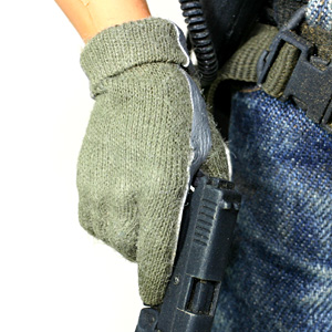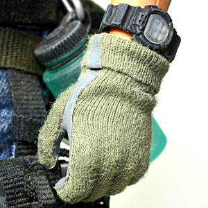 | ↑ノーメックスグローブはグレーの合皮と浅いオリーブグリーン風カラーのニット生地をHOT TOYSの固定ハンドに直接ボンド(布用、瞬着併用)で貼って作成。 |