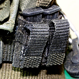 ↑2連のハンドマグポーチは以前作ったGreen Beret Projectの時と同様にハンドメイド。 ただし、今回はフラップ部分のパーツとなるウェビングを、既製品の3ミリ幅から4ミリに変更。これは5ミリ幅の端をハサミでカットし、ライターで炙って焼き留めして使用しました。 これで、より実物の雰囲気が出せたと思います。あ、マガジンポーチはM9用で作っていたので、グロックのマガジンはタイト過ぎて入りませんでした…(^_^;) |