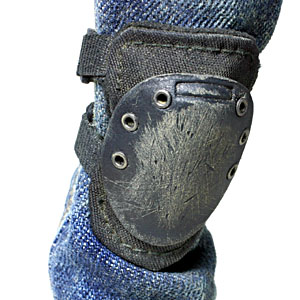 | ↑ニーパッドはa.c.e.製。 ハトメを打って、金ヤスリで適当に引っ掻いてキズを作りパステルで仕上げました。 このa.c.e.のニーパッドは後発だけあって、非常に良く出来ており、同タイプの中では一番好みです。 |